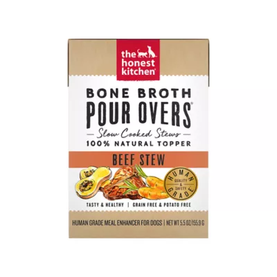 Description: Even the pickiest pups can't resist The Honest Kitchen's Bone Broth Pour Overs®. Add the taste and nutritional benefits of bone broth to help support gut and joint health with this human grade meal topper. Packed with ranch raised beef, use it as a daily topper to your dog's food or freeze it in their favorite enrichment toy for a fun, healthy snack.