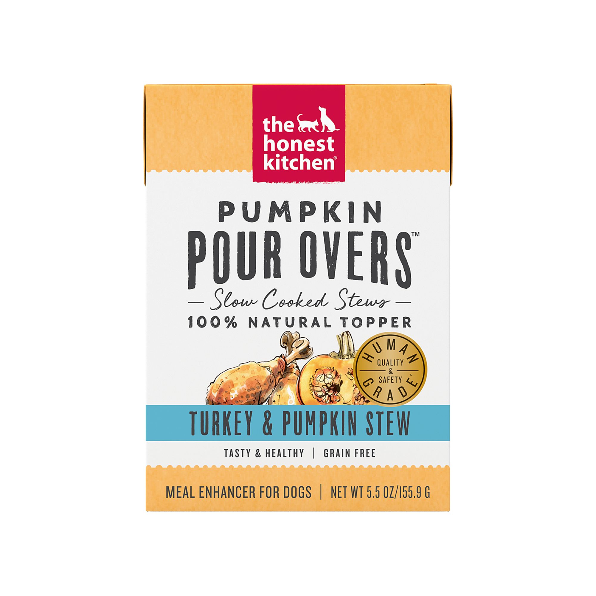 Description: Unbox the power of pumpkin with The Honest Kitchen's Pumpkin Pour Overs. Made with wild caught salmon, fiber–rich pumpkin, pureed apples and cinnamon, this human grade meal topper is great for adding variety and taste while helping to support healthy digestion. Use it as a daily topper, an occasional mix–in to add variety or as a base for frozen treat creations.