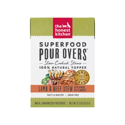 Description: Packed with antioxidant–rich leafy greens like spinach, kale and broccoli, The Honest Kitchen's Superfood Pour Overs make it easy to add variety, protein and nutritious ingredients to your dog's bowl. Human grade and made with ranch raised lamb and beef, serve this meal topper fresh or freeze it in an enrichment toy or lick mat for a fun, healthy treat.