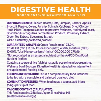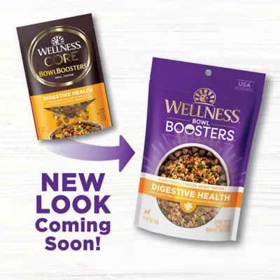 Digestive Health Dog Food Topper: You eat superfoods to support your health and overall vitality and so should your dog; Formulated with fiber from fruits and vegetables plus probiotics for gut healthFlavor And Function: Wellness CORE Bowl Boosters dog food toppers are made with freeze dried meat, wholesome grains, and vegetables; It makes a great training treat and helps picky dogs eat their foodMake Every Meal Their Best Meal: Upgrade your dog's meal time with Wellness CORE Bowl Boosters dog food toppers; Add variety and flavor while helping boost digestive, joint, skin, coat, and heart healthA Lifetime Of Well-being: Each of our recipes is designed to support your pet through all life stages; Crafted to support strong immune systems, optimal energy and help maintain vitalityWellness Nutrition: Created by nutritionists, veterinarians, and animal lovers, our recipes provide an ideal balance of nature's finest ingredients, carefully selected to nourish and sustain your pet's well-being