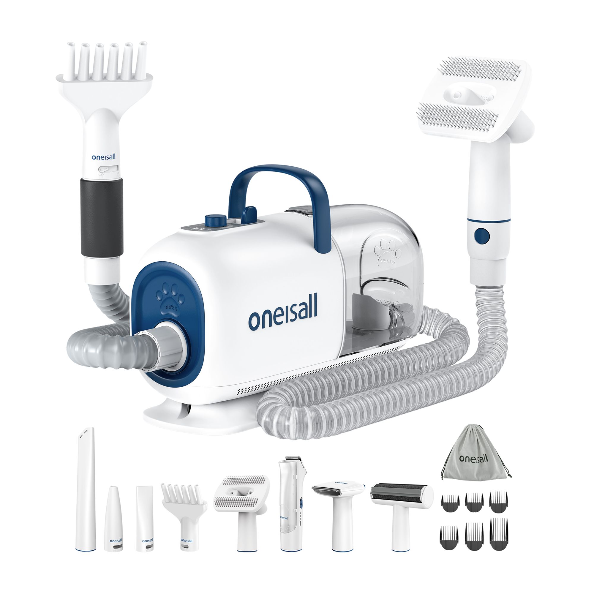 Includes: 1 Vacuum with hose, 1 Grooming Brush, 1 Hair Remover, 1 Nozzle, 1 Tool Stand, 4 Clipping Combs, 1 Cleaning Brush, 1 Electric Clipper