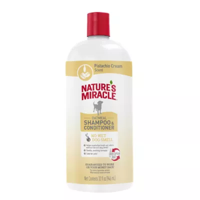 When strong dog odors start to crinkle your nose, it's time for Nature's Miracle™ Oatmeal Shampoo and Conditioner! The reformulated shampoo helps neutralize odors and freshens with a light pistachio cream scent, without the wet dog smell. Enriched with colloidal oatmeal, aloe vera and keratin, this shampoo provides moisture and shine and soothes skin for the ultimate grooming experience.
