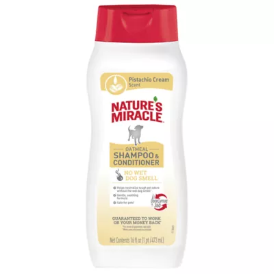 Features: When strong dog odors start to crinkle your nose, it's time for Nature's Miracle™ Oatmeal Shampoo and Conditioner! The reformulated shampoo helps neutralize odors and freshens with a light pistachio cream scent, without the wet dog smell. Enriched with colloidal oatmeal, aloe vera and keratin, this shampoo provides moisture and shine and soothes skin for the ultimate grooming experience. Plus, our bottles are made with 25% Post-Consumer Recycled Materia