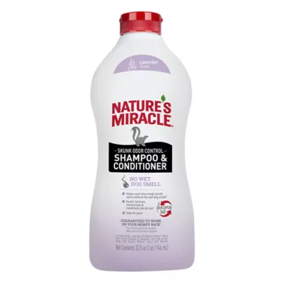 pet stain and odor removers and disinfectants to undo. Whether it happens to you, your pet or your home, few experiences are as daunting as being sprayed by a skunk. Nature's Miracle Skunk Odor Control Shampoo & Conditioner helps remove skunk odors from pets. Bottle update with easy pour makes cleanup easier. Odor Capture 360 helps control tough skunk odors without the wet dog smell! The formula safely helps neutralize odors on contact, when used and stored as directed, leaving a fresh lavender scent behind. Safe for use on pets when used and stored as directed - see product label for use and handling instructions. For best results, clean pet with NM Skunk Odor Control Shampoo and Conditioner then treat surface areas with Nature's Miracle Skunk Odor Remover. Formulated without parabens and added dyes. pH Balanced for Dogs and Cats. Freshens with a light, lavender scent.