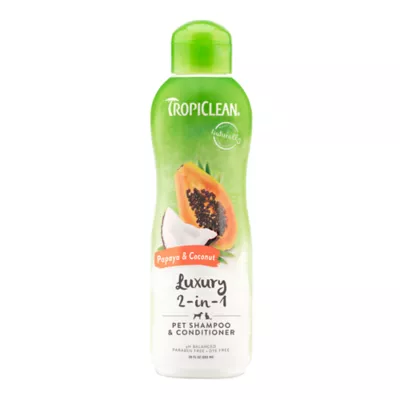 Description and Overview: TROPICLEAN 2 IN 1 LUXURY SHAMPOO + CONDITIONER gently cleanses, moisturizes, and conditions your pet's skin and coat with a nourishing, pH–balanced formula. This luxurious blend helps loosen tangles for easier brushing, leaving fur soft, silky, and irresistibly touchable. Infused with the tropical aroma of papaya and coconut, every bath leaves your pet fresh, pampered, and ready for cuddles!