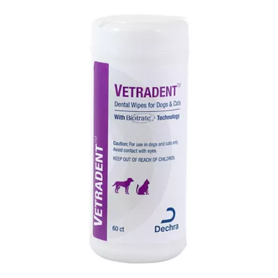 Description and Overview: VETRADENT Dental Wipes are scientifically formulated with Biotrate Technology to control tartar by working against bacteria and altering the environment in the pet's oral cavity. VETRADENT Dental Wipes large size make it easy to remove tartar and build–up, and remove bacterial growth.