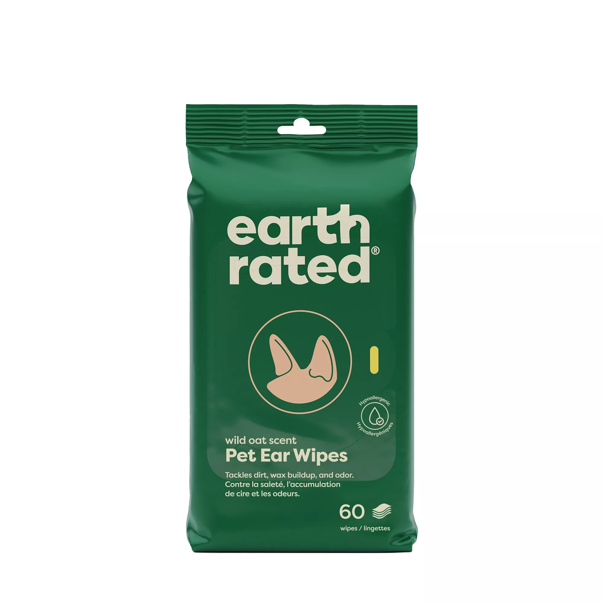 Earth Rated Hypoallergenic Ear Wipes for Dogs and Cats, Wild Oat Scent, 60 Count
