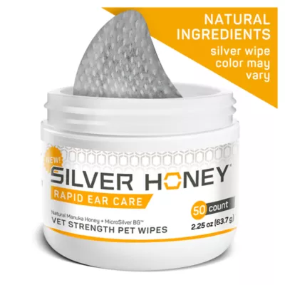 Silver Honey Rapid Ear Care is a line of revolutionary ear care solutions. Silver Honey Vet Strength Pet Wipes are sold separately from the Ear Treatment kit. They are used to remove debris, dirt, and wax to help keep bacteria from entering inside the inner ear. 50ct Jar. Wipes away debris, dirt, and wax to help keep bacteria from entering inside the inner ear.