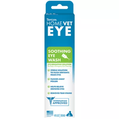 Description and Overview: TropiClean HomeVet Soothing Eye Wash clears eyes of irritants and itching. Our gentle formula also provides safe, sting–free cleaning of eye crust and tear staining for dogs and cats.