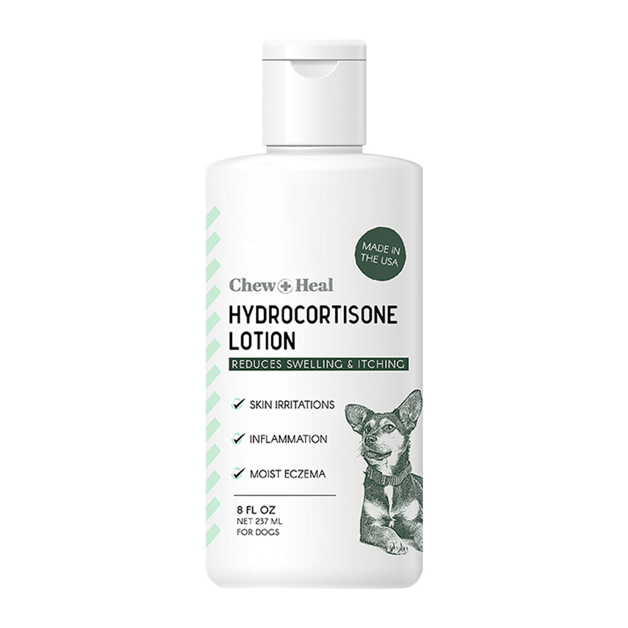 Chew + Heal Hydrocortisone Skin Lotion First Aid Essential features hydrocortisone , and is known for its anti-itch effects. This can be helpful for soothing bug bites, small rashes, itchy skin and other irritations. Chew + Heal's Hydrocortisone Lotion will help your pet deal with Flea bites, dermatitis, skin irritations, moist eczema, inflammations and itching. Coming in a refreshing lotion, this product can be applied to even the most finicky of dogs. Chew + Heal is all about providing the best for your pup based on their unique needs. We recognize the level of care and attention that every dog needs, and our catalog is carefully curated to provide effective, useful, and tasty products that will improve your dog's quality of life. Our products are all made in the USA in cGMP & FDA-audited facilities, and our top goal is your fur baby's health and happiness. Whether it's supplements, first aid products or functional treats, you can trust our team to produce products of the highest quality and provide unparalleled customer care. Chew + Heal's Hydrocortisone Lotion is a must-have for every pet owner. Bring comfort and relief to your beloved companion's skin with the trusted choice in pet care. Your pet's well-being is our priority. This specialized lotion is expertly formulated to alleviate skin rashes, inflammation, and itching caused by various irritants, such as insect bites, moist eczema, and flea bite dermatitis.
