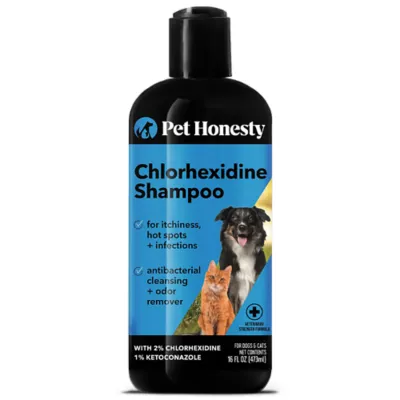 . Pet Honesty's Chlorhexidine Antibacterial Cleansing + Odor Remover Dog Shampoo contains 2% chlorhexidine and 1% ketoconazole. Together, these ingredients help fight bacteria and fungus, relieving itchy skin, rashes and hot spots, while also helping to heal skin infections and wounds. This powerful, yet gentle shampoo also has a pleasant cucumber melon scent that helps remove odors caused by bacteria and fungus, which can later lead to uncomfortable and smelly skin problems. The aloe in this formula helps soothe and calm the skin, especially if your buddy is experiencing itching, redness or irritation caused by skin infections, wounds, rashes, hot spots and even bug bites. Honesty is our name - that's why we formulate our products to best support your pet's health using our most effective ingredients you recognize and trust, so you can spend more joyful moments together