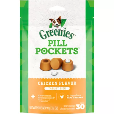 PILL POCKETS TURN PILL TIME INTO TREAT TIME. GREENIES Pill Pockets Treats for Dogs make it easy to give your dog medicine, with a tasty chicken flavor they're sure to love. Why hide your pet's medicine in human foods like peanut butter or cheese when you can give them a healthy all natural dog treat, made with natural, real ingredients plus trace nutrients instead? Designed by veterinarians, GREENIES Pill Pockets Dog Treats mask the smell and taste of any medicine, taking the stress (and mess) out of giving your canine companion medicine. Whether for large breed or small dogs, these smaller-sized Pill Pockets for tablets make taking medicine a positive experience for your dog. And they're easy to give: Simply drop a tablet into the Pill Pockets pouch, pinch the top half closed, give it to your pup, and poof: Watch their medicine disappear. GREENIES Pill Pockets are the ingenious way to give your dog their meds - and they'll never know the difference.