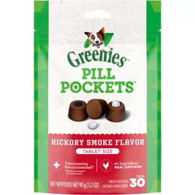 PILL POCKETS TURN PILL TIME INTO TREAT TIME. GREENIES Pill Pockets Treats for Dogs make it easy to give your dog medicine, with a tasty hickory smoke flavor theyâre sure to love. Why hide your pet's medicine in human foods like peanut butter or cheese when you can give them a healthy all natural dog treat, made with natural, real ingredients plus trace nutrients instead? Designed by veterinarians, GREENIES Pill Pockets Dog Treats mask the smell and taste of any medicine, taking the stress (and mess) out of giving your canine companion medicine. Whether for large breed or small dogs, these smaller-sized Pill Pockets for tablets make taking medicine a positive experience for your dog. And they're easy to give: Simply drop a tablet into the Pill Pockets pouch, pinch the top half closed, give it to your pup, and poof: Watch their medicine disappear. GREENIES Pill Pockets are the ingenious way to give your dog their meds - and they'll never know the difference.