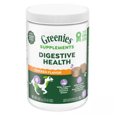 From the makers of vet recommended GREENIES Dental Treats, comes GREENIES Digestive Health Supplements. These supplements contain GREENIES BIOTIC BLEND of a probiotic, prebiotic, and postbiotic to support a healthy digestive system and optimal stool quality. GREENIES Digestive Health Supplements are also crafted with real chicken for irresistible taste and contains no artificial flavors, preservatives, or colors*. Made with quality ingredients from around the world, formulated by a team of PH.D animal nutritionists, and contains the National Animal Supplement Council Quality Seal, you know you're providing your best doggy friend digestive health supplements they will love. Support your dogâs health with GREENIES Digestive Health Supplements.