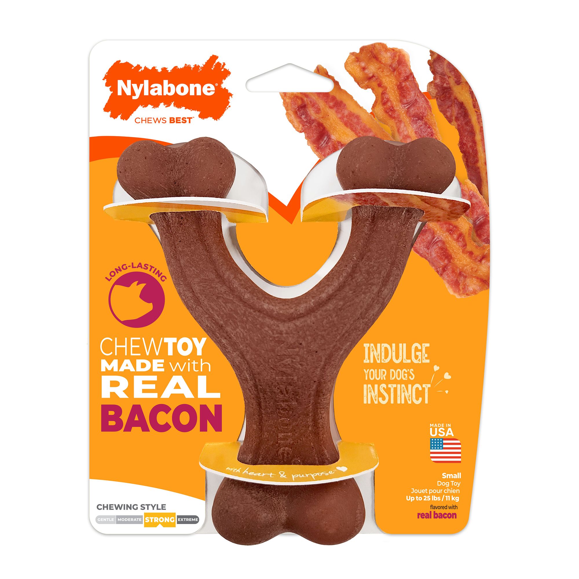 Dogs love to chew, especially on stuff that tastes like real bacon. The Wishbone is easy to handle, tastes awesome, and stands up to heavy chewing. It's curved for a paw-friendly grip so your pup can quickly grab it and get a good chew going. Think about it: dogs don't have thumbs. The Wishbone is our flagship. Since dogs don't have thumbs, why give them a chew that you can pick up and they can't? With real bacon infused all the way through, your dog's wish will come true.