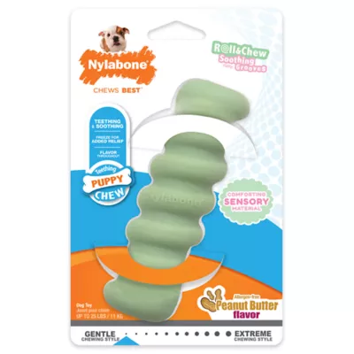 Alleviate your pup's teething discomfort with this puppy teething toy! Specially designed in a comforting sensory material, this chew toy provides relief during the teething phase. First up, the stick features soothing grooves and irresistible peanut butter flavor throughout. The fun shape also rolls to help engage pups and fight boredom! Plus, it can be frozen for even more comfort on sore gums!