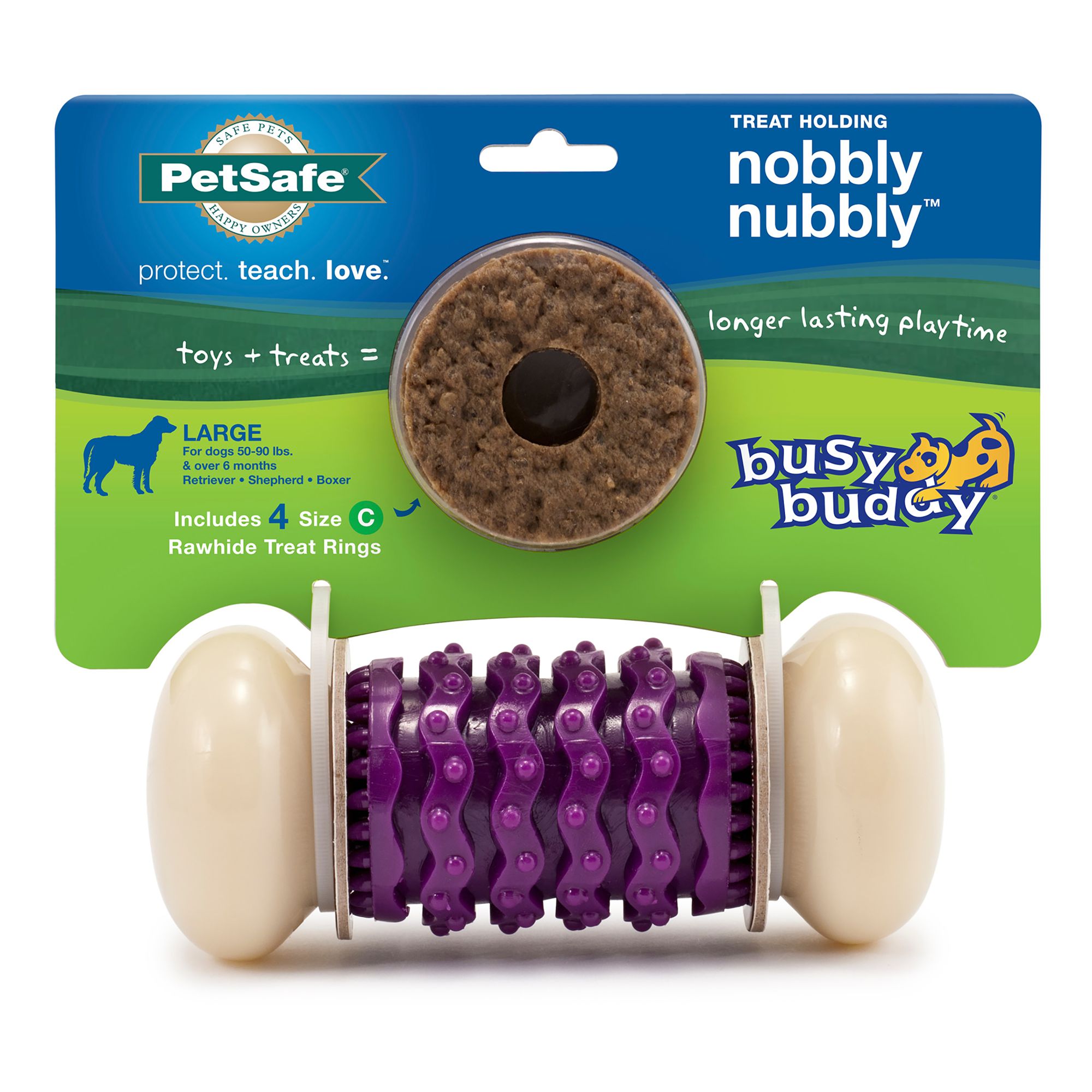 Features: Cures boredom and relieves anxiety by keeping your dog busy and engaged; Long-lasting toy (with treat rings) will keep your dog busy for 20-30 minutes of play; Cleans teeth and gums while chewing on grooves and crevices; Chicken scented rubber is BPA free; Top