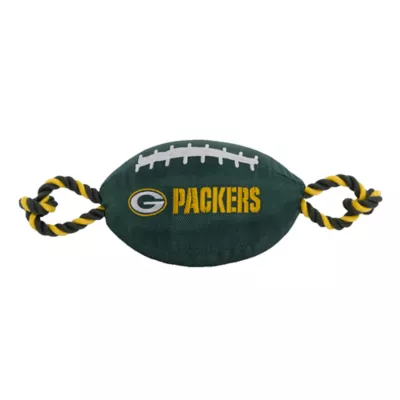 Green Bay Packers Football Rope Dog Toy. Shaped like a football with an embroidered team logo, this toy is made from durable nylon. It features colored rope on either side to provide pet parents with a better grip during tug-o-war, and also has a squeaker on the inside to keep your pup interested. Show off your team spirit and give your paw-tner a fun fetch or tug plaything with the Pets First Football Rope Dog Toy.