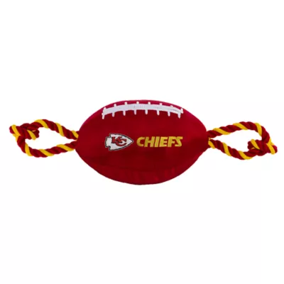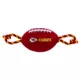 Kansas City Chiefs Football Rope Dog Toy. Shaped like a football with an embroidered team logo, this toy is made from durable nylon. It features colored rope on either side to provide pet parents with a better grip during tug-o-war, and also has a squeaker on the inside to keep your pup interested. Show off your team spirit and give your paw-tner a fun fetch or tug plaything with the Pets First Football Rope Dog Toy.