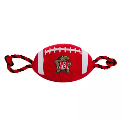 University of Maryland Football Rope Dog Toy. Shaped like a football with an embroidered team logo, this toy is made from durable nylon. It features colored rope on either side to provide pet parents with a better grip during tug-o-war, and also has a squeaker on the inside to keep your pup interested. Show off your team spirit and give your paw-tner a fun fetch or tug plaything with the Pets First Football Rope Dog Toy.