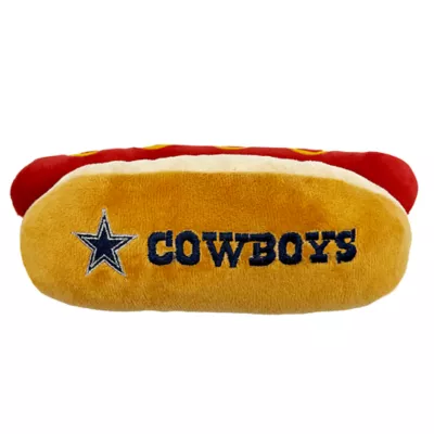 Bring the ballgame home to your furry friend with the Pets First Dallas Cowboys Hot Dog Pet Toy. This fuzzy footlong looks just like the classic stadium snack and features your favorite team's logo. It's pawfect for long games of catch with your best bud! Each toy includes four squeakers for extra innings of play. Plus, it's made with ultra-soft fabric so your pup can snuggle up before the next game.