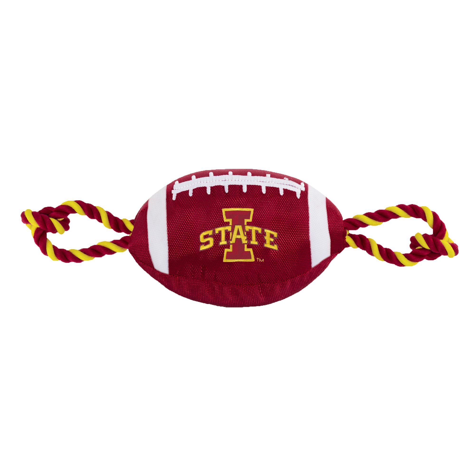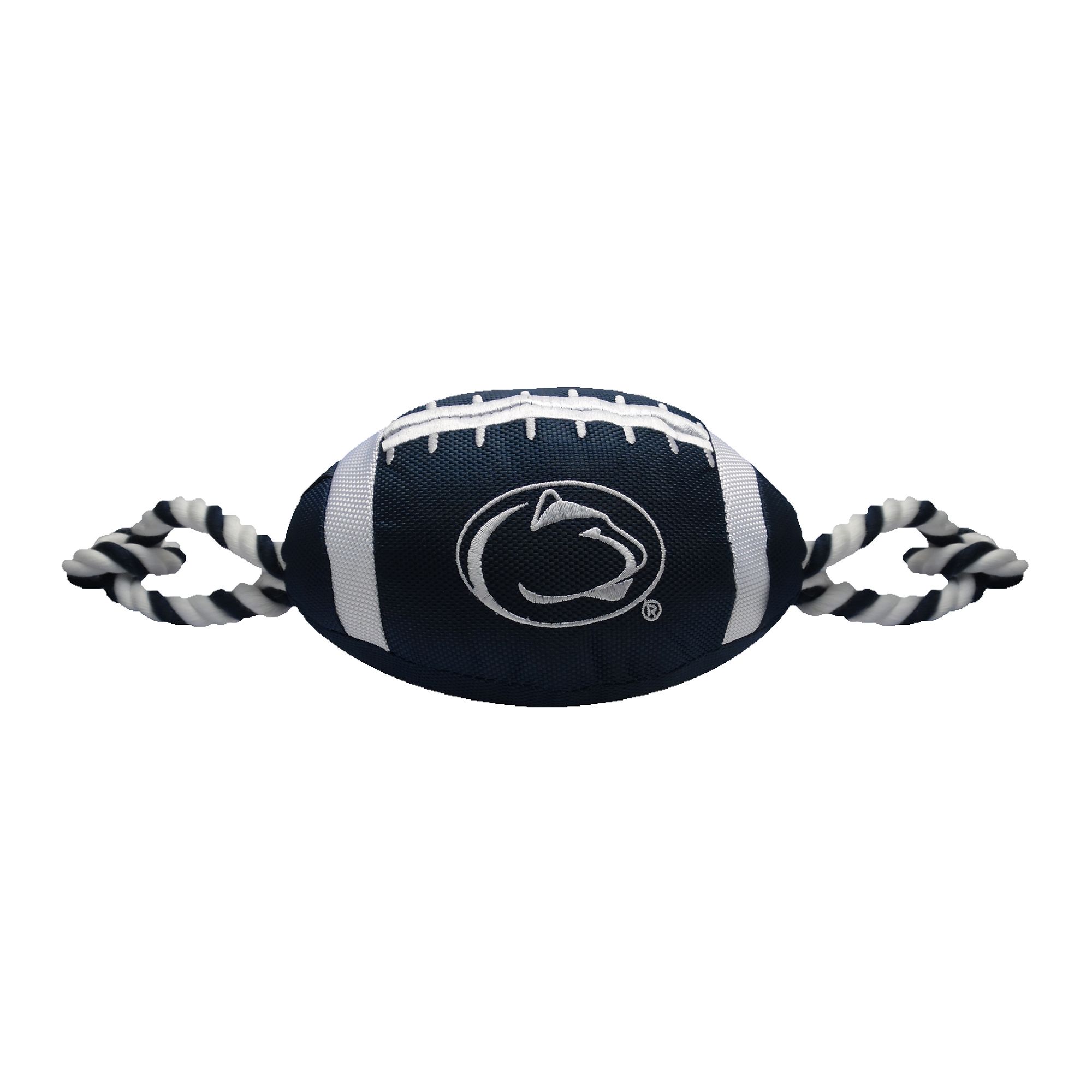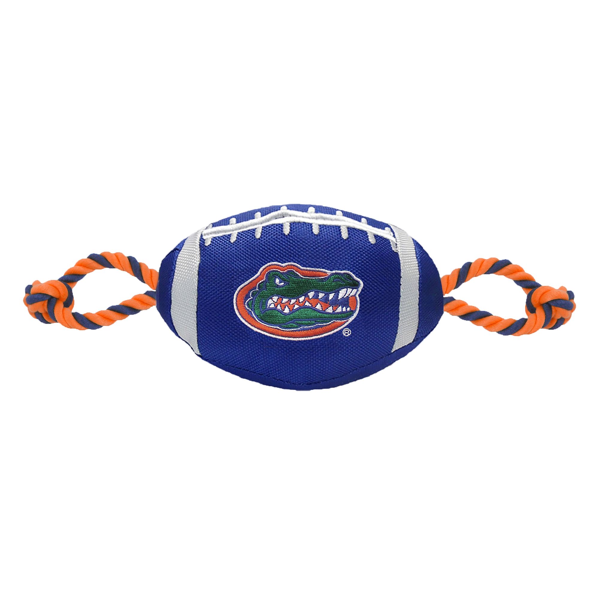 Florida State University Football Rope Dog Toy. Shaped like a football with an embroidered team logo, this toy is made from durable nylon. It features colored rope on either side to provide pet parents with a better grip during tug-o-war, and also has a squeaker on the inside to keep your pup interested. Show off your team spirit and give your paw-tner a fun fetch or tug plaything with the Pets First Football Rope Dog Toy.