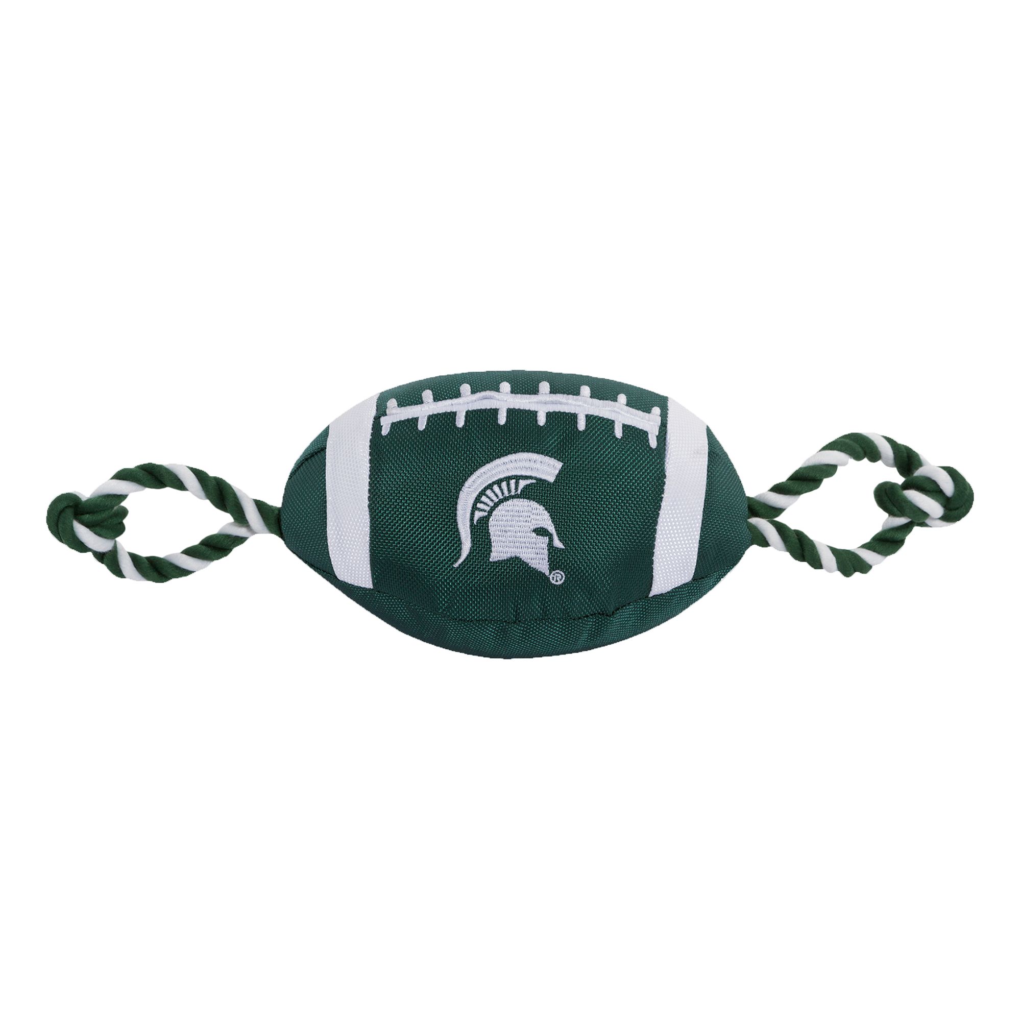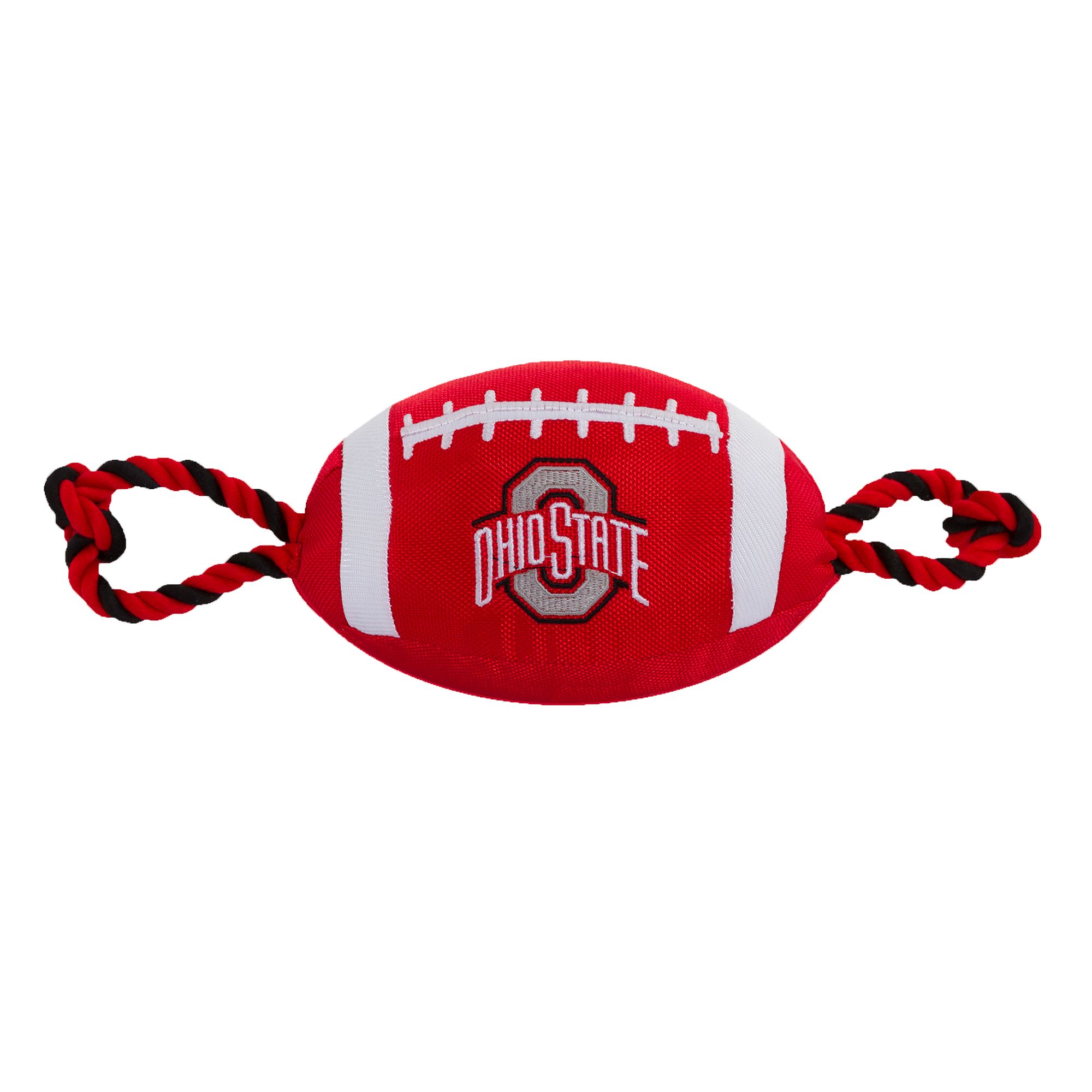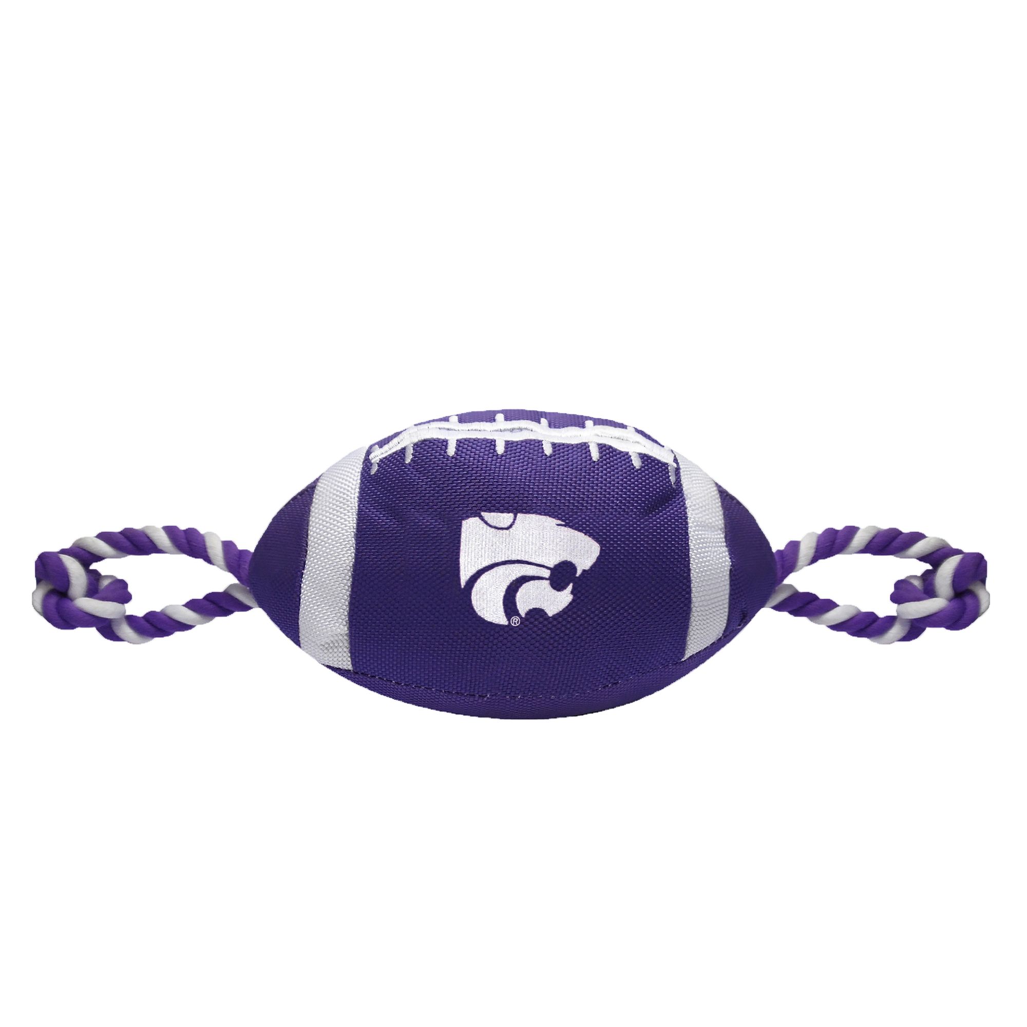 Florida State University Football Rope Dog Toy. Shaped like a football with an embroidered team logo, this toy is made from durable nylon. It features colored rope on either side to provide pet parents with a better grip during tug-o-war, and also has a squeaker on the inside to keep your pup interested. Show off your team spirit and give your paw-tner a fun fetch or tug plaything with the Pets First Football Rope Dog Toy.