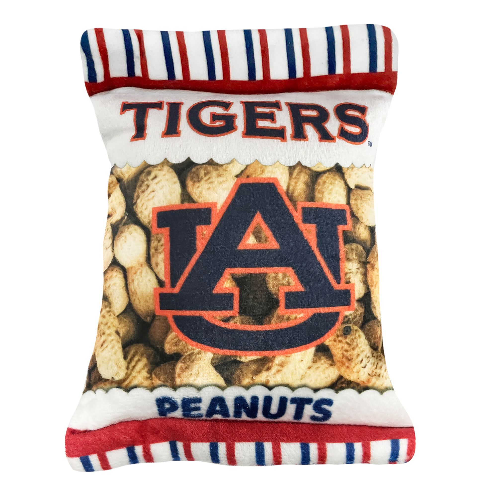 Bring the ballgame home to your furry friend with the Pets First LSU Tigers Peanut Bag Dog Toy. This plush peanut bag looks just like the classic stadium snack and features your favorite team's logo. It's pawfect for long games of catch with your best bud! Each toy includes four squeakers for extra innings of play. Plus, it's made with ultra-soft fabric so your pup can snuggle up before the next game.