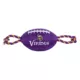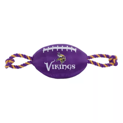 Minnesota Vikings Football Rope Dog Toy. Shaped like a football with an embroidered team logo, this toy is made from durable nylon. It features colored rope on either side to provide pet parents with a better grip during tug-o-war, and also has a squeaker on the inside to keep your pup interested. Show off your team spirit and give your paw-tner a fun fetch or tug plaything with the Pets First Football Rope Dog Toy.