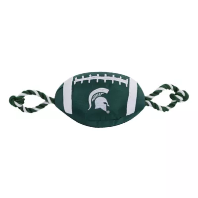 Michigan State University Football Rope Dog Toy. Shaped like a football with an embroidered team logo, this toy is made from durable nylon. It features colored rope on either side to provide pet parents with a better grip during tug-o-war, and also has a squeaker on the inside to keep your pup interested. Show off your team spirit and give your paw-tner a fun fetch or tug plaything with the Pets First Football Rope Dog Toy.