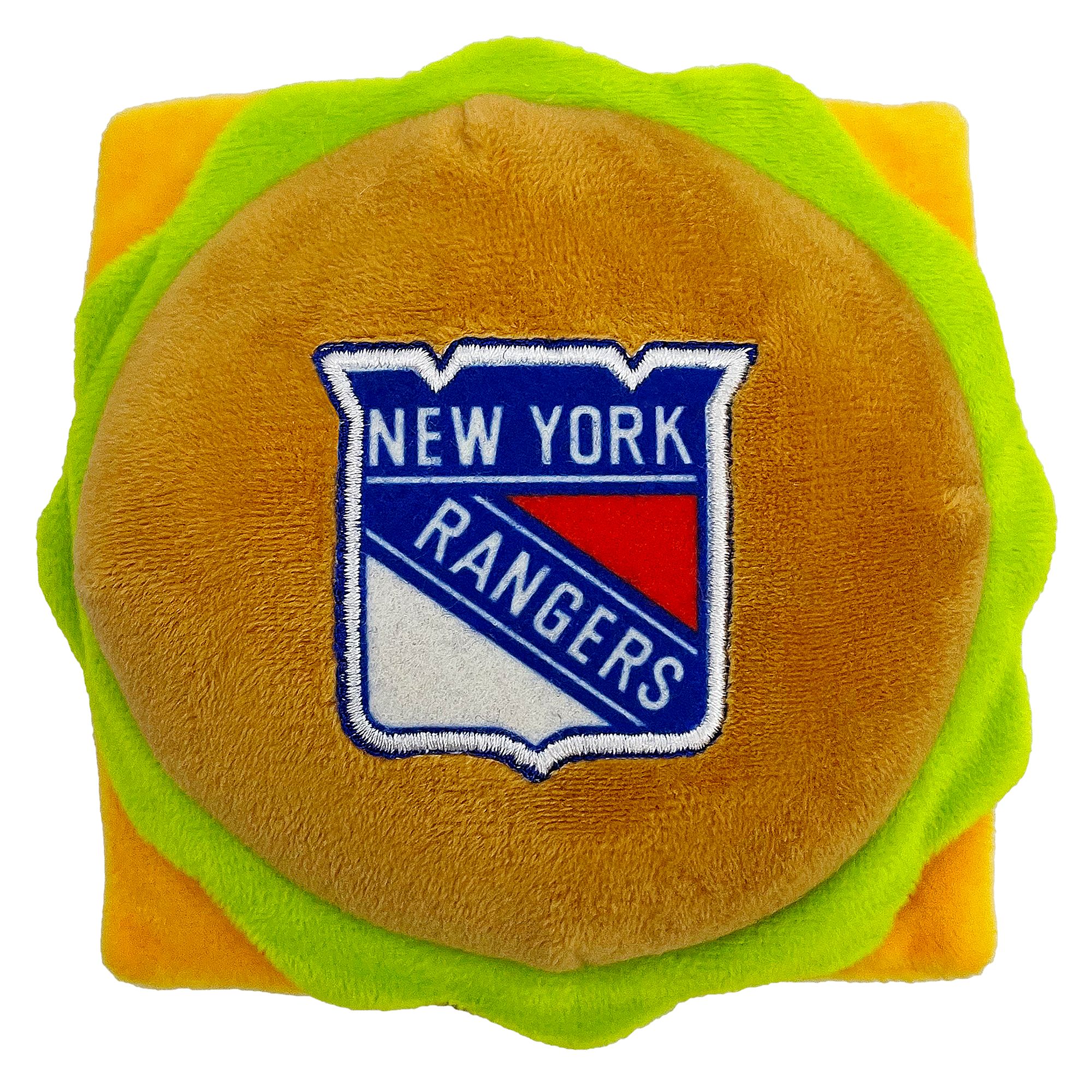 Bring the ballgame home to your furry friend with the Pets First New York Yankees Hamburger Dog Toy. This big burger looks just like the classic stadium snack and features your favorite team's logo. It's pawfect for long games of catch with your best bud! Each toy includes four squeakers for extra innings of play. Plus, it's made with ultra-soft fabric so your pup can snuggle up before the next game.