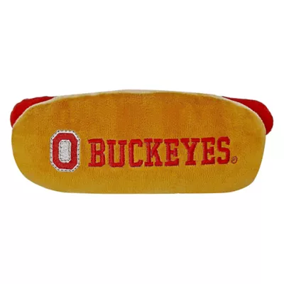 Bring the ballgame home to your furry friend with the Pets First Ohio State Buckeyes Hot Dog Pet Toy. This fuzzy footlong looks just like the classic stadium snack and features your favorite team's logo. It's pawfect for long games of catch with your best bud! Each toy includes four squeakers for extra innings of play. Plus, it's made with ultra-soft fabric so your pup can snuggle up before the next game.