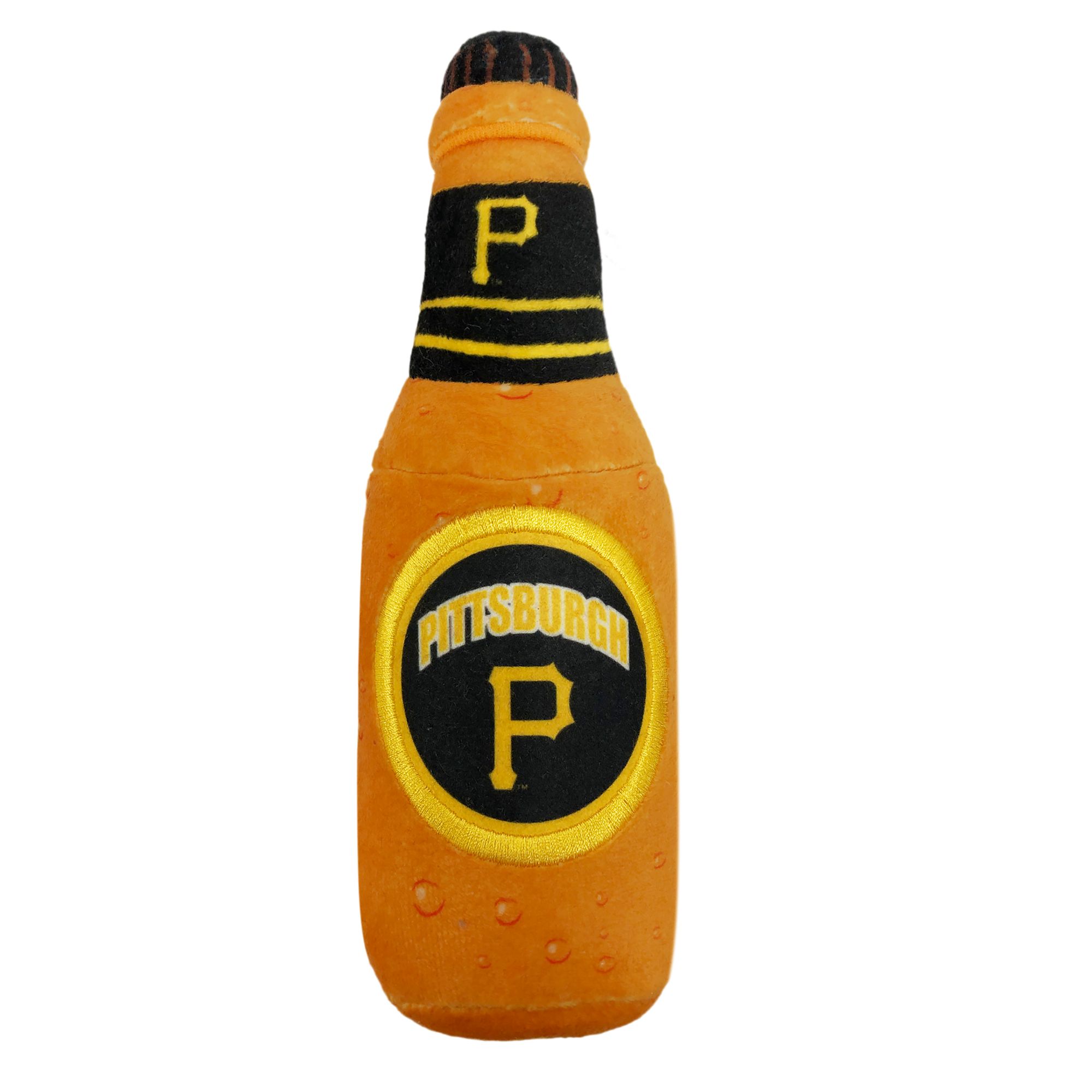 Bring the ballgame home to your furry friend with the Pets First Pittsburgh Steelers Bottle Dog Toy. This plush refreshment looks just like a classic stadium snack and features your favorite team's logo. It's pawfect for long games of catch with your best bud! Each toy includes four squeakers for extra innings of play. Plus, it's made with ultra-soft fabric so your pup can snuggle up before the next game.