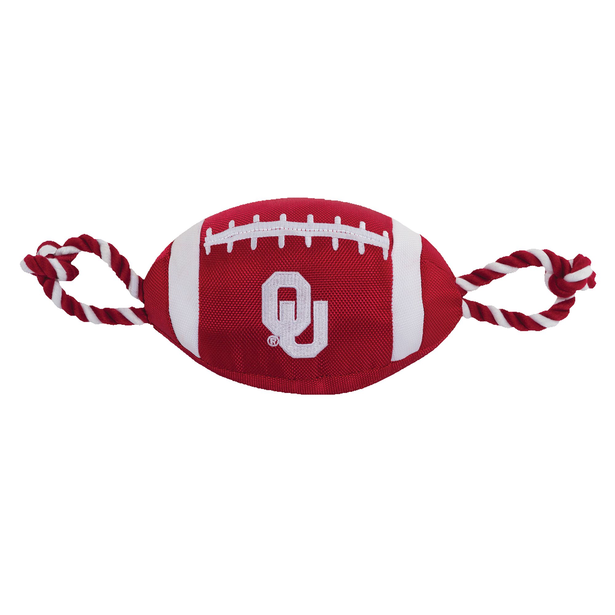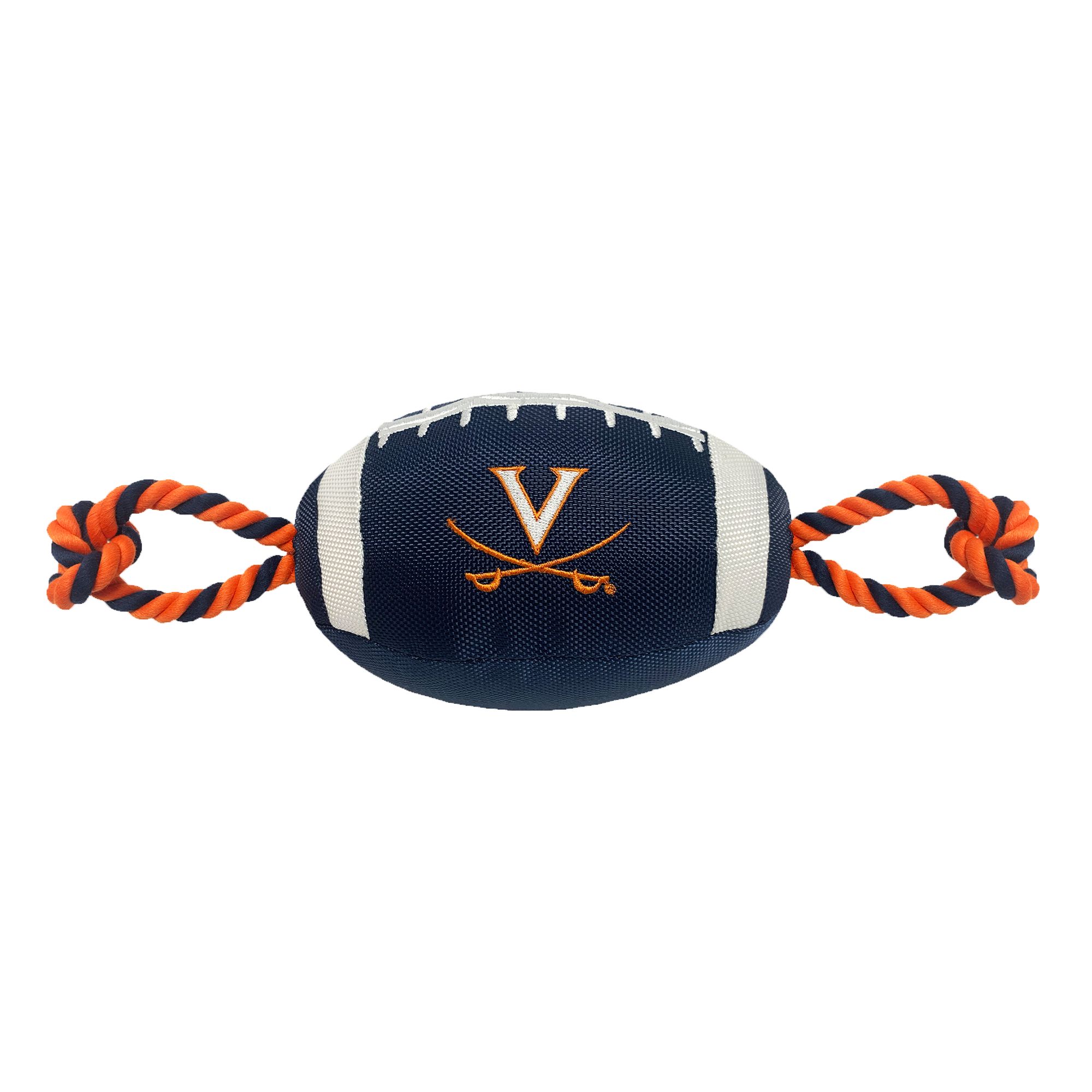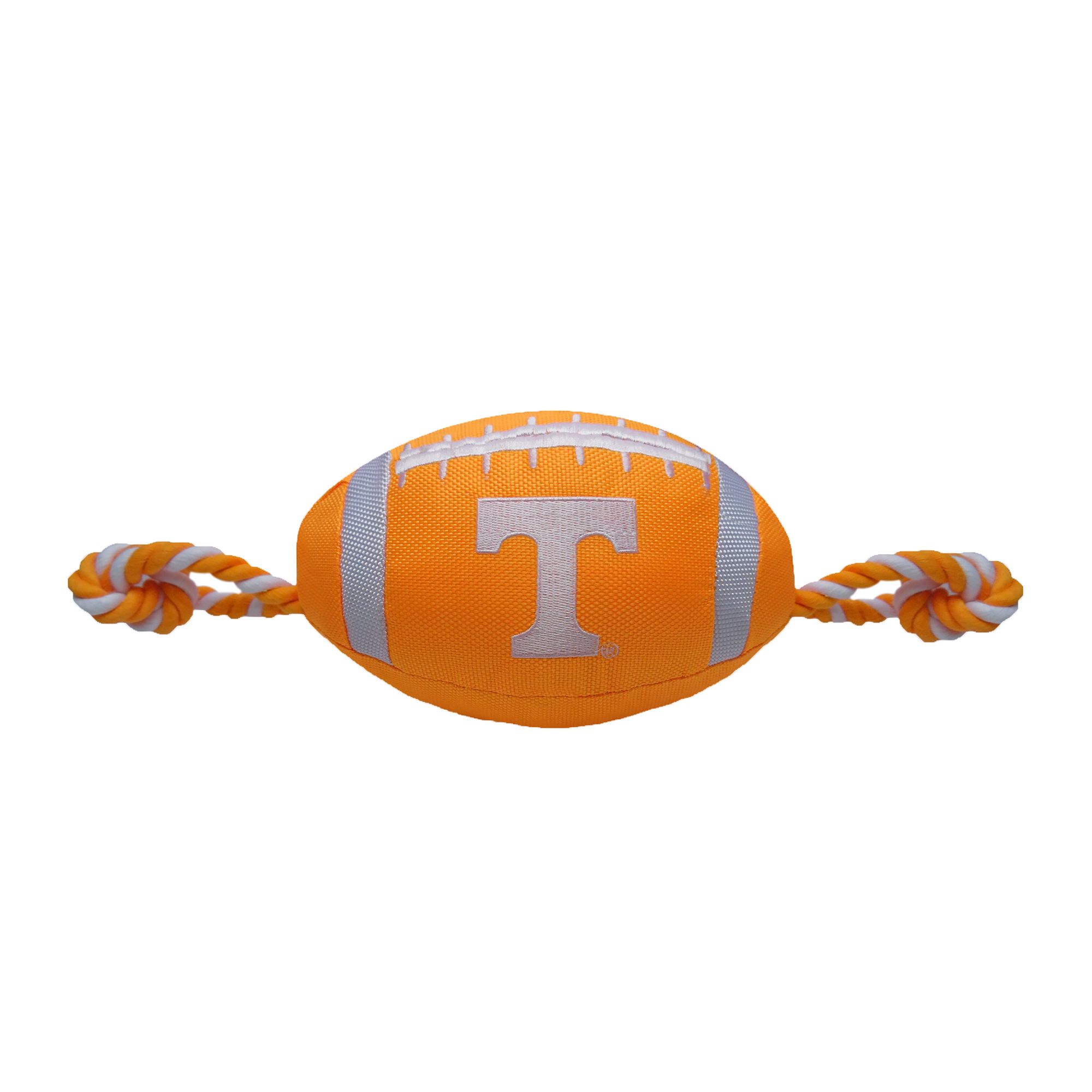 San Francisco 49ers Football Rope Dog Toy. Shaped like a football with an embroidered team logo, this toy is made from durable nylon. It features colored rope on either side to provide pet parents with a better grip during tug-o-war, and also has a squeaker on the inside to keep your pup interested. Show off your team spirit and give your paw-tner a fun fetch or tug plaything with the Pets First Football Rope Dog Toy.