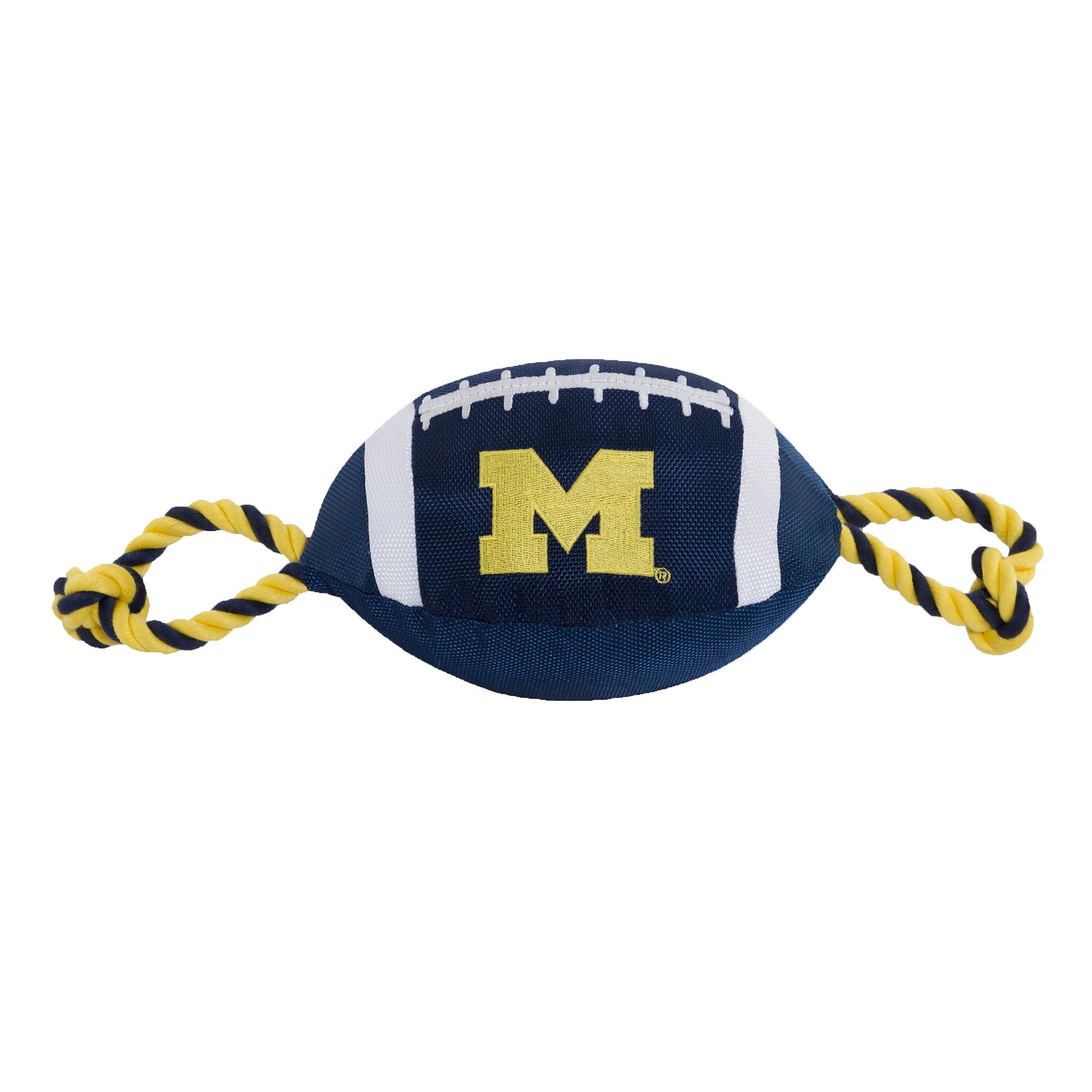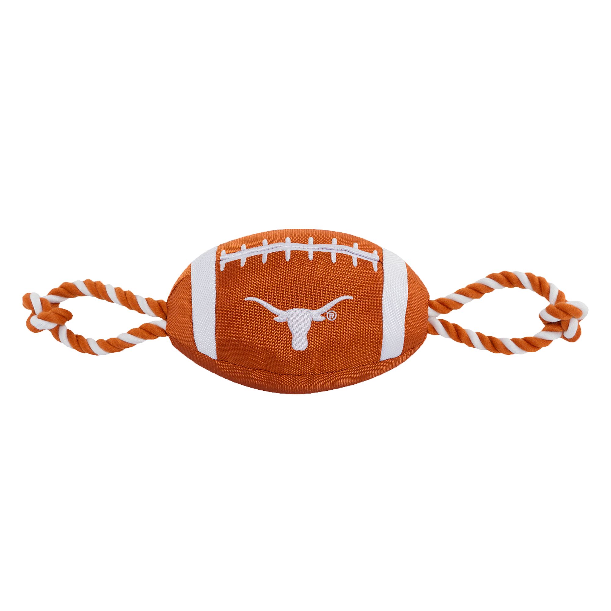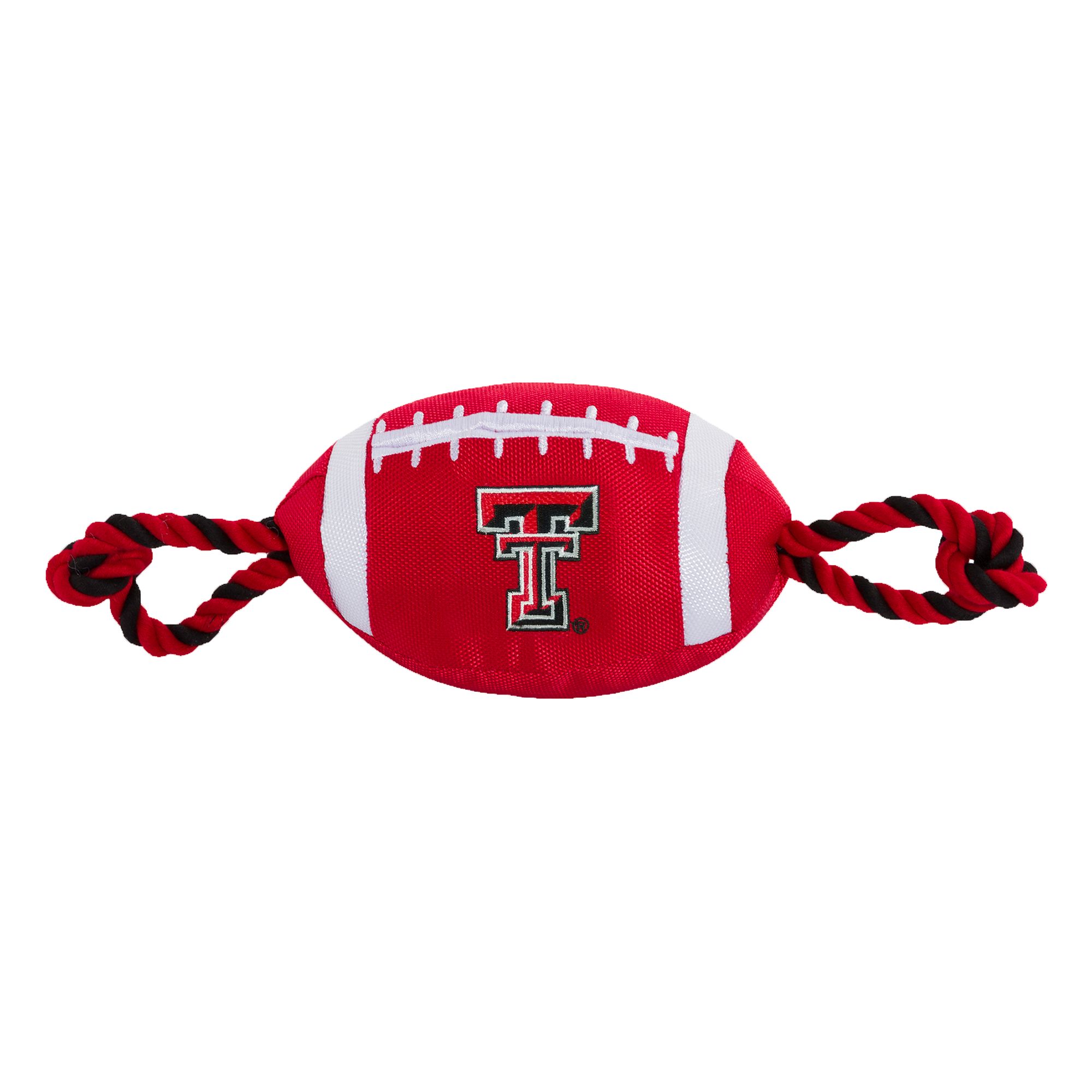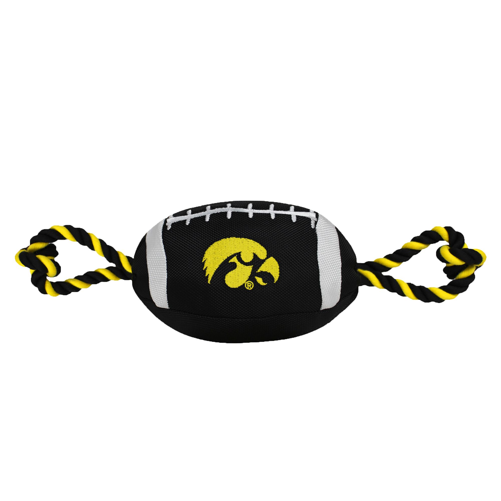 San Francisco 49ers Football Rope Dog Toy. Shaped like a football with an embroidered team logo, this toy is made from durable nylon. It features colored rope on either side to provide pet parents with a better grip during tug-o-war, and also has a squeaker on the inside to keep your pup interested. Show off your team spirit and give your paw-tner a fun fetch or tug plaything with the Pets First Football Rope Dog Toy.