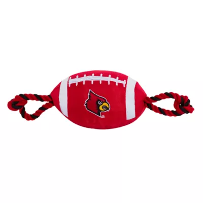 University of Louisville Football Rope Dog Toy. Shaped like a football with an embroidered team logo, this toy is made from durable nylon. It features colored rope on either side to provide pet parents with a better grip during tug-o-war, and also has a squeaker on the inside to keep your pup interested. Show off your team spirit and give your paw-tner a fun fetch or tug plaything with the Pets First Football Rope Dog Toy.
