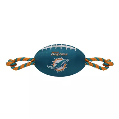 Get your furry friend ready for game day with this Pets First Miami Dolphins Football Rope Dog Toy. Shaped like a football with an embroidered team logo, this toy is made from durable nylon. It features colored rope on either side to provide pet parents with a better grip during tug-o-war and also has a squeaker on the inside to keep your pup interested. Show off your team spirit and give your paw-tner a fun fetch or tug plaything with the Pets First Football Rope Dog Toy.
