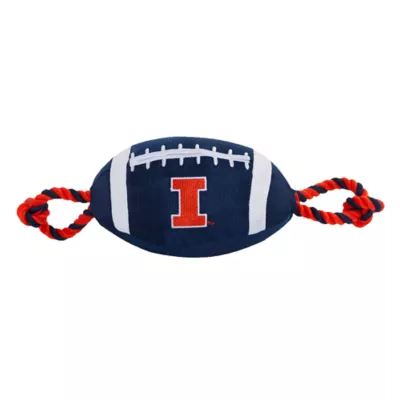 University of Illinois Football Rope Dog Toy. Shaped like a football with an embroidered team logo, this toy is made from durable nylon. It features colored rope on either side to provide pet parents with a better grip during tug-o-war, and also has a squeaker on the inside to keep your pup interested. Show off your team spirit and give your paw-tner a fun fetch or tug plaything with the Pets First Football Rope Dog Toy.