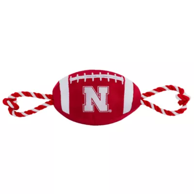 University of Nebraska Football Rope Dog Toy. Shaped like a football with an embroidered team logo, this toy is made from durable nylon. It features colored rope on either side to provide pet parents with a better grip during tug-o-war, and also has a squeaker on the inside to keep your pup interested. Show off your team spirit and give your paw-tner a fun fetch or tug plaything with the Pets First Football Rope Dog Toy.