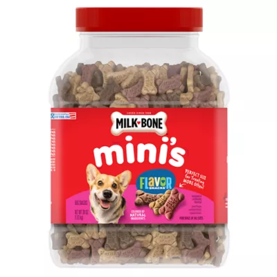 Make your dog's life more fun by turning up the flavor. Milk-Bone Flavor Snacks dog biscuits feature the same vitamin-fortified goodness of Milk-Bone Original dog snacks in 3 delicious flavors your dog will love: beef, chicken and bacon. They're baked with love for wholesome goodness you can feel good about. And at only 5 calories each, these tasty mini dog treats are right-sized for treating more often. Better yet, the crunchy texture of Milk-Bone dog biscuits helps freshen dogs' breath and reduce tartar build-up, which means you can fully enjoy all those sloppy doggie kisses your dog will dole out to thank you. Order now to give your dog the simple, genuine joy that your dog gives you every day.