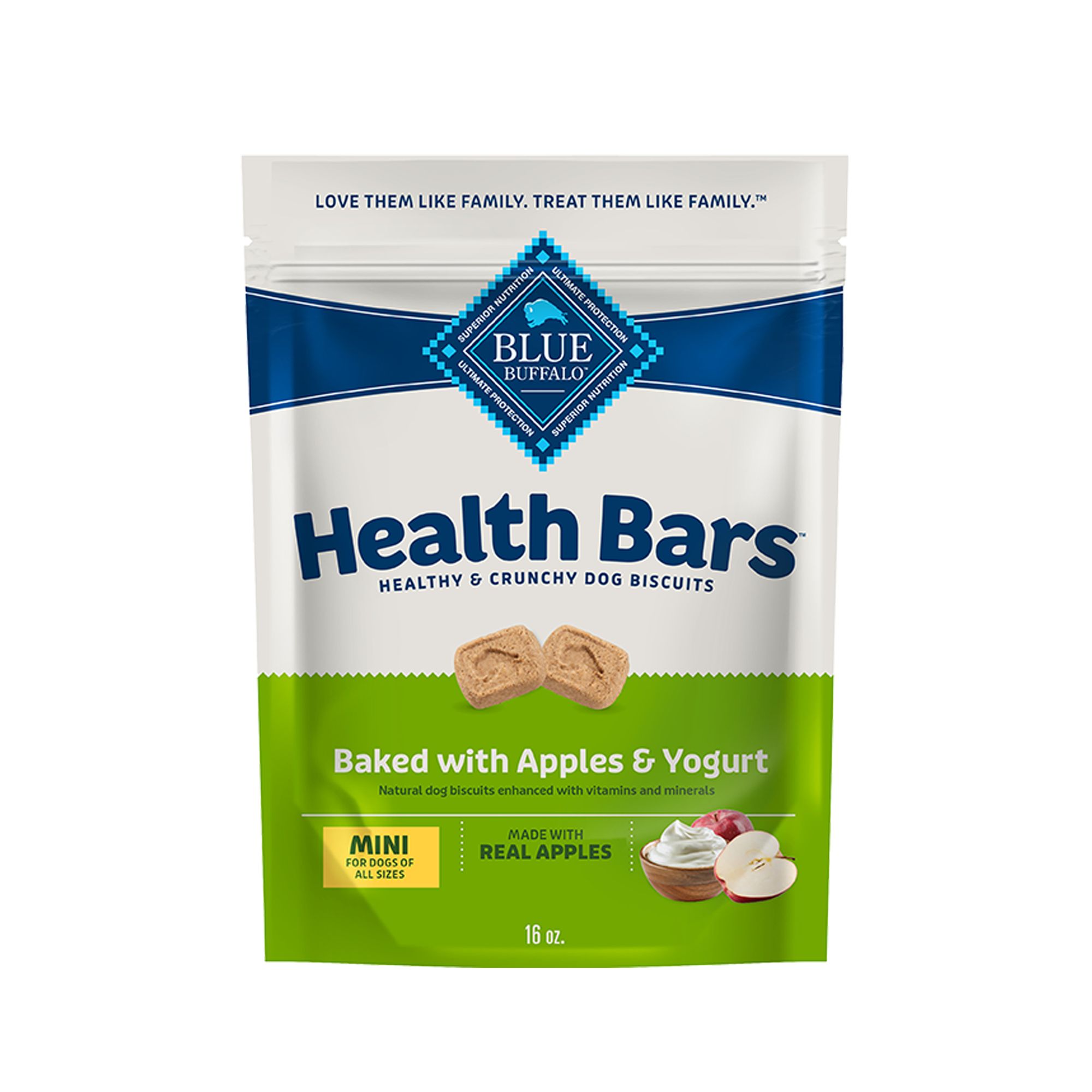 - Contains: One (1) 16-oz bag of BLUE Health Bars Natural Crunchy Dog Treats Biscuits, Apples & Yogurt