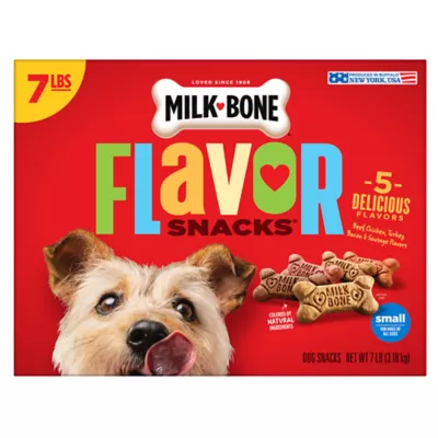 Make your dog's life more fun by turning up the flavor. Milk-Bone Flavor Snacks dog biscuits feature the same vitamin-fortified goodness of Milk-Bone Original dog snacks in 5 delicious flavors your dog will love: beef, turkey, chicken, bacon and sausage. These tasty dog treats are baked with love for wholesome goodness you can feel good about. Better yet, the crunchy texture of Milk-Bone dog biscuits helps freshen dogs' breath and reduce tartar build-up, which means you can fully enjoy all those sloppy doggie kisses your dog will dole out to thank you. Order now to give your dog the simple, genuine joy that your dog gives you every day.