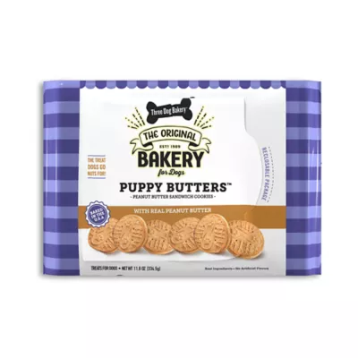 At Three Dog Bakery®, we craft people-inspired treats but just for dogs. A peanut butter sandwich cookie will always be a beloved treat. We were inspired to craft a tasty version made just for your pup. Two peanut butter cookies with creamy peanut butter inside, the drool-worthy aroma will keep your pup coming back for more. Crafted with love and real ingredients, they are sure to be a favorite.