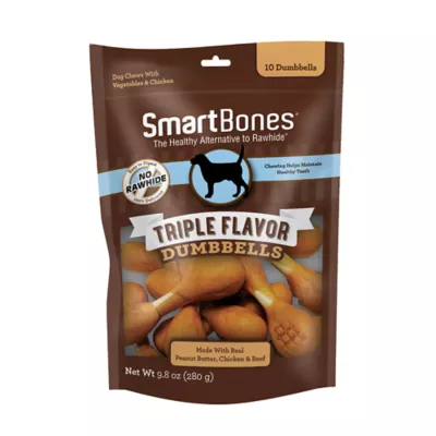 Made with peanut butter, chicken and beef and vitamin- and mineral-enriched, SmartBones Triple Flavor Dumbbells are a healthy alternative to rawhide with an irresistible taste dogs dream about. Treat your pup to these easy-to-digest and 100 percent delicious chews. Chewing helps maintain healthy teeth. Contains 10 chews. Give your dog one to two SmartBones chews per day. Always supervise your pup during chewing activity. These chews are intended for intermittent or supplemental feeding only. Select a chew slightly larger than your petâs mouth. Discard chunks or fragments. Always provide plenty of fresh drinking water and visit your veterinarian regularly. Store in a cool, dry place. After opening, reseal or store in an airtight container to preserve freshness.