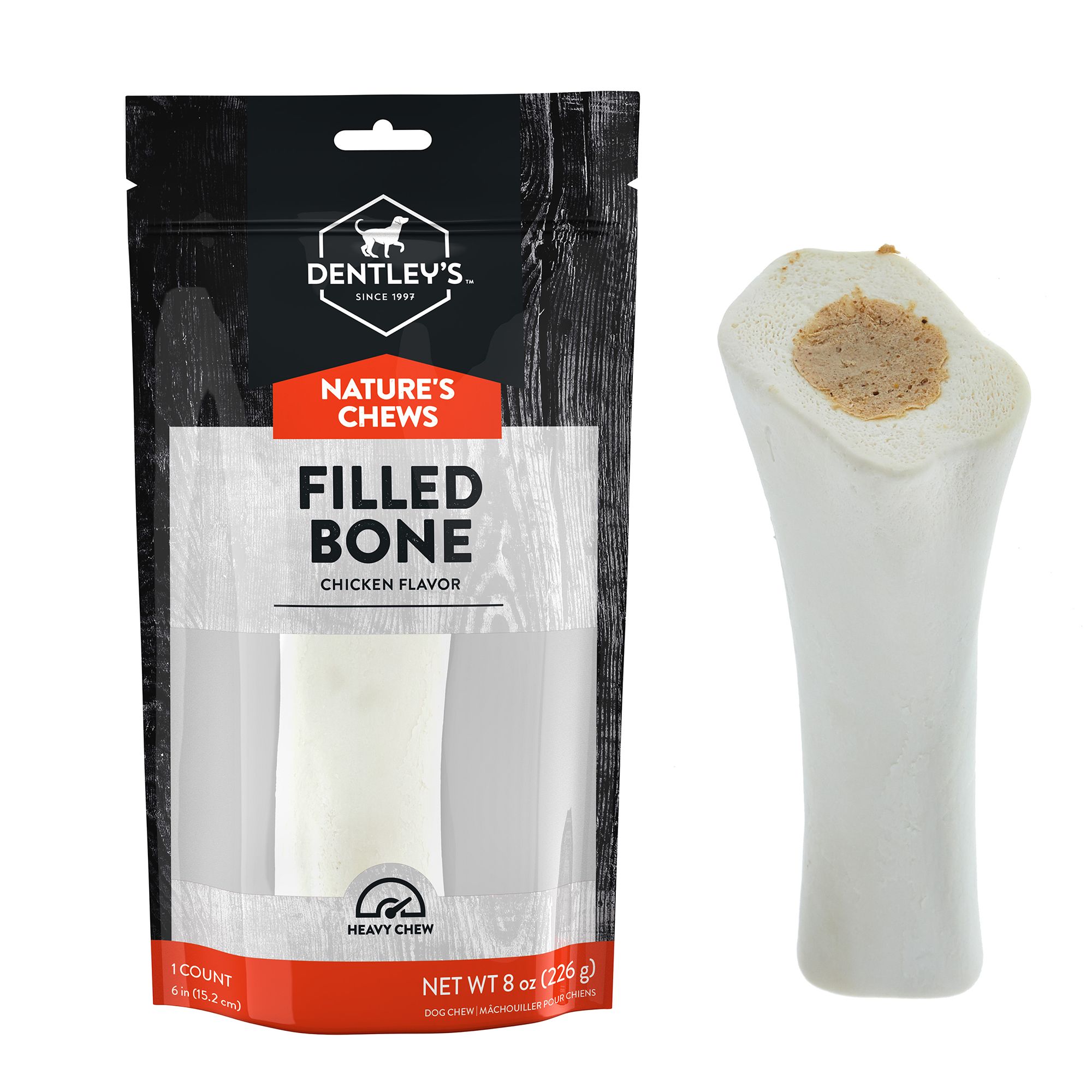 Dogs love sinking their teeth into a Dentley's Center Cut Stuffed Femur Bone with Real Peanut Butter. Our bold flavors satisfy their taste buds and their instinctive urge to chew. These long-lasting chews not only keep your best friend busy, but through abrasive chewing, they help keep their teeth clean, too.
