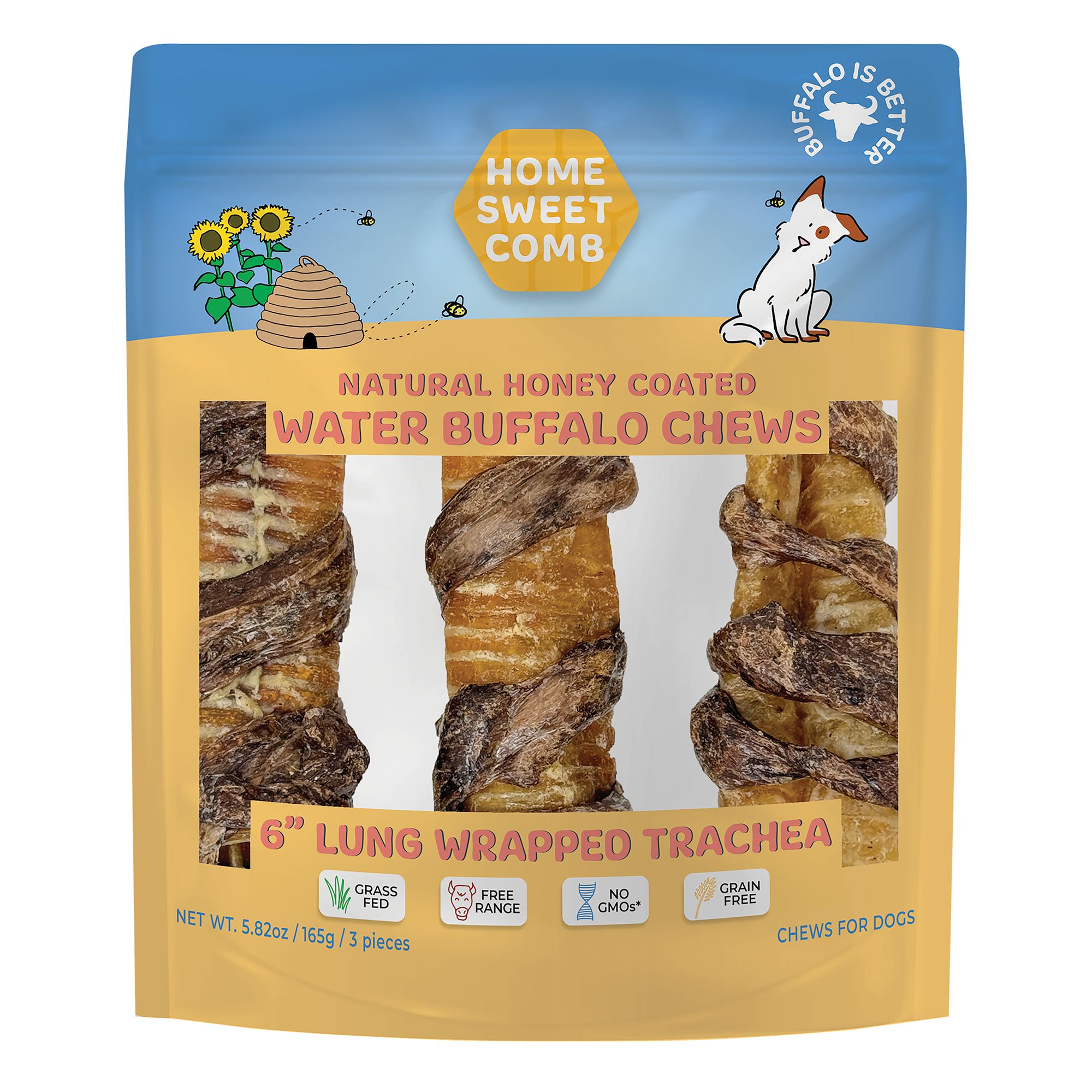 Give your dog a groovy treat to remember with Home Sweet Comb 6" Lung Wrapped Trachea Tubes. These totally tubular treats feature grooves and a crunchy texture, to help keep your pup's pearly whites clean and healthy as he chews. They're made from grass-fed, free-range buffalo and a kiss of natural honey, with no grain or GMOs to cause you or you pup any grief. Give your best friend this long-lasting, nutritious treat that'll make him sit up and beg every time you open a bag!Made from free-range buffalo trachea, Lung and delicious natural honey. Grass-fed buffalo chews provide long-lasting taste and keep dogs happily occupied. Recipe contains no GMO ingredients. Grain-free goodness makes these treats grr-eat for sensitive pups. No added hormones or antibioticsHoney coating adds an additional layer of palatability with a sweet and savory flavor profile
