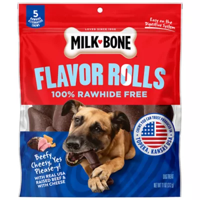 Now, this is a chew your dog will gladly roll over for. Meet Milk-Bone Flavor Rolls, safe and delicious rawhide alternative dog chews from a brand you can trust. These one hundred percent rawhide free dog chews come in bold flavor combinations your dog will love, with a fun rolled shape that keeps dogs interested as they methodically chew away. (Bonus: The long-lasting chewing action helps clean teeth.) They're produced in Topeka, Kansas, USA, with cheese and real USA-raised beef for a downright drool-worthy taste. And you can feel good knowing they're as easy on the digestive system as they are easy to enjoy, making them a perfect rawhide alternative. Try out these rolls of tasty goodness to entertain your dog - and give dog life a little more flavor.