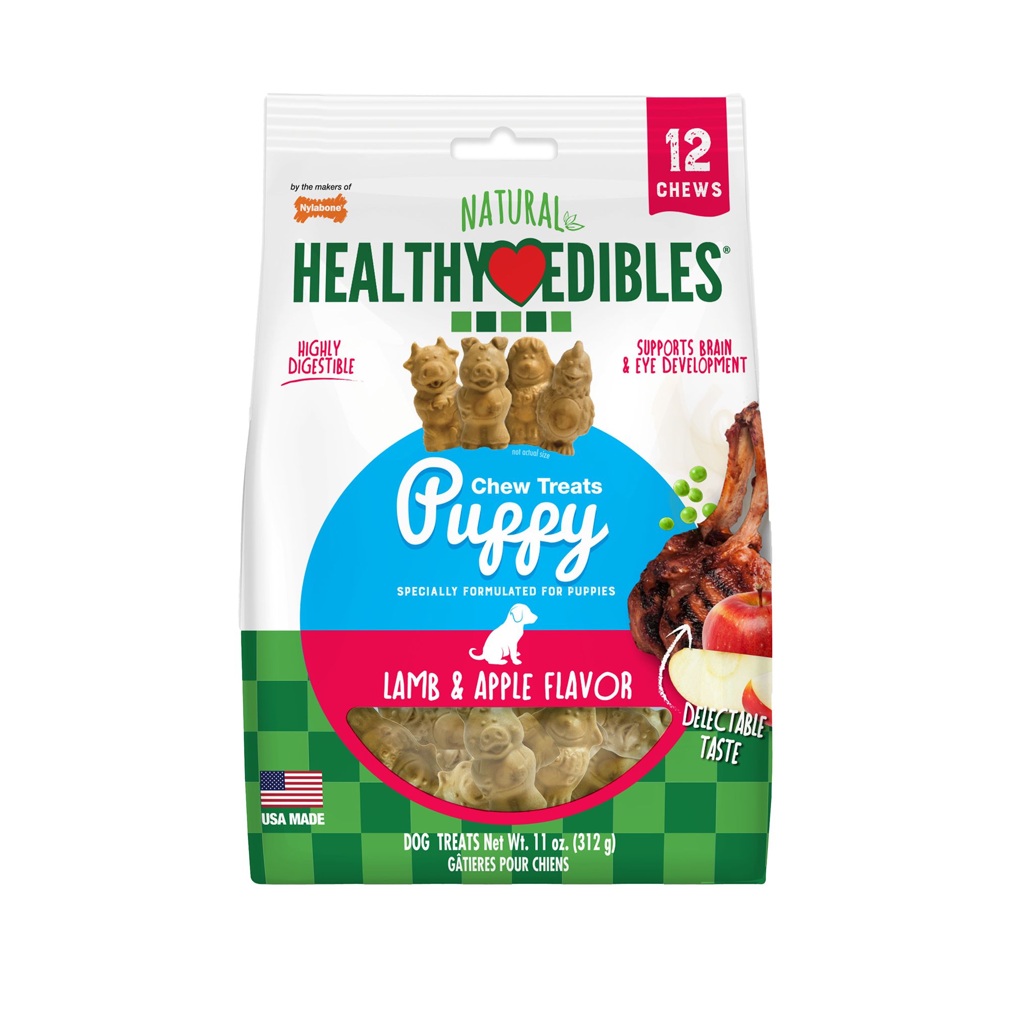 Nylabone Healthy Edibles Puppy Natural Long-Lasting Lamb & Apple Flavor Dog Chew Treats are both delicious and nutritious. These treats are highly digestible and support brain and eye development, and feature the great tastes of lamb and apple in each and every bite.