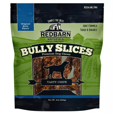 Since 1996, Redbarn has been making dog chews with the safety and health of your pet in mind. Redbarn's Original Flavored Bully Slices are cow hide coated in an irresistible bully stick gravy. Each dog chew contains ingredients to support your dog's joint health. Redbarn Bully Slices also help maintain a healthy smile by gently scraping harmful plaque from your dog's teeth.