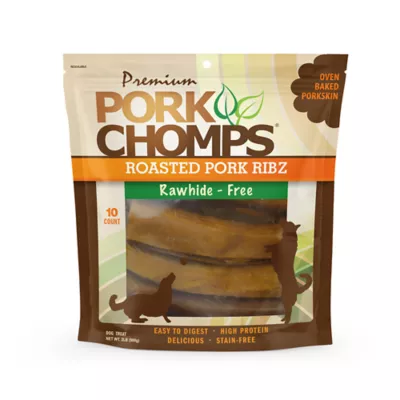 Let your dog satisfy his urge to chew with Pork Chomps Roasted Pork Ribs. These rawhide-free treats made of oven-roasted pork skin taste delicious and are easy to digest. High in protein, they are also stain-free and offer hours and hours of chewing fun.